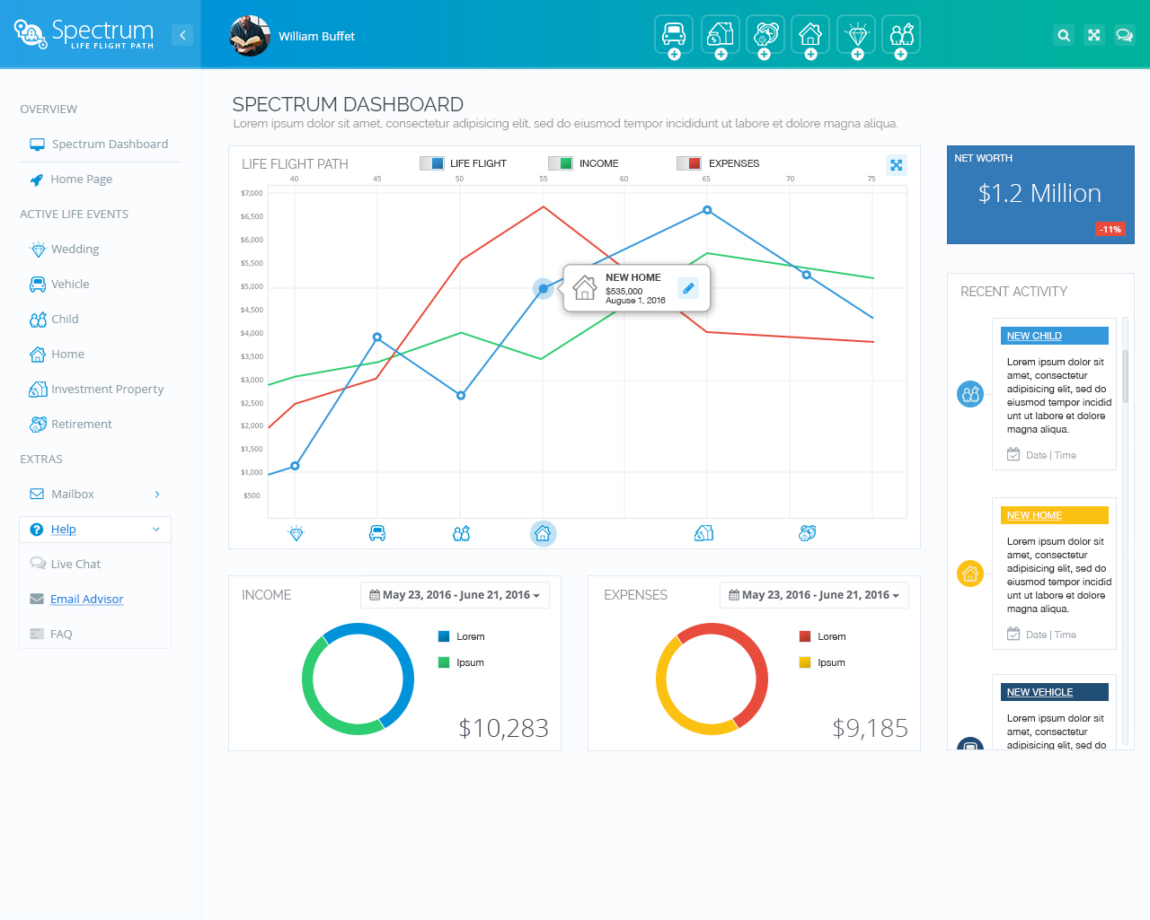 The dashboard is a Bootstrap Admin Theme that is responsive. Dashboard modules can be added, removed, sized, and configured to include everything at a glance. Graphs are expandable to full screen with toggles that can turn on/off individual lines. The menu on the left is collapsible and there are sections for Help and a Mailbox. The navigation at the top has shortcuts to the different life events. There is also a Profile Avatar that can have preferences configured. One addition is the Recent Activity scroll on the right that shows what the user has done in a chronological order.